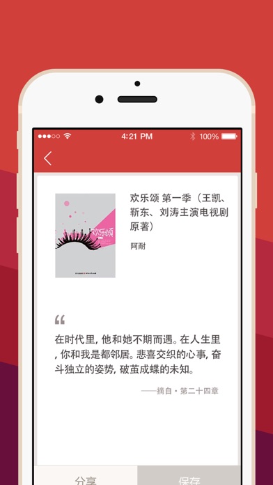 刘涛、王凯、蒋欣、王子文、杨紫、靳东等领衔主演的热播电视剧《欢乐颂》原著小说。 《琅琊榜》、《伪装者》、《他来了请闭眼》同一团队打造的影视剧同名原著! 都市女性职场情感小说。讲述了五位各自携带过往和憧憬的年轻女性先后住进欢乐颂小区22楼,发生的一波三折的故事。心怀梦想的大龄“胡同公主”樊胜美、大家闺秀闷骚文艺女关雎尔、没头脑和不高兴的综合体邱莹莹,在海市合租一套房,与高智商的海归金领安迪、做事从不按牌理出牌的富二代小妖精曲筱绡,同住在一个名叫“欢乐颂”的中档小区的22楼,上演着中国版“老友记”。生活虽然一地鸡毛,但仍要欢歌高进,成长之路虽有玫瑰有荆棘,但什么都不能阻挡坚强的心。 《欢乐颂》既是婚恋指南,教人辨识各色男人更教人尊从内心去爱;也是职场宝典,既有江湖规矩也有生存指南。处处闪耀着处世智慧,堪称一部女性成长完全手册。