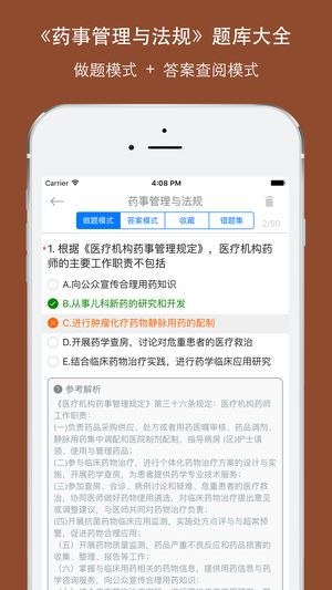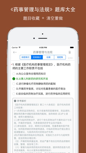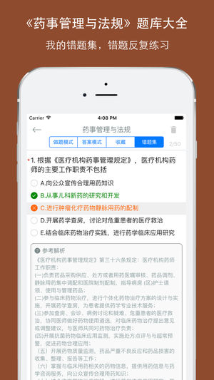 执业药师药事管理与法规专项训练题库包括了历年的执业药师中药师和西药师药事管理与法规考试题库,题量非常大和丰富。包括了单选题、多选题。非常丰富内容及答案解析,是考生参考执业药师考试必备练习题库 功能有做题模式、答案模式、收藏、错题集功能,离线做题,统计做题情况,非常方便实用 《药事管理与法规》是执业药师职责和执业活动必须具备的知识与能力,考查目的重在评价、培养和指导执业药师法制意识、责任意识、自律意识、服务意识,从而确保准入人员具有合法执业能力、高尚职业道德,并能够更好地保护患者基本权利、尊重患者隐私。要求重点掌握药学实践中与合法 执业直接相关的法律法规规定,并能够理解国家医药卫生政策的具体…