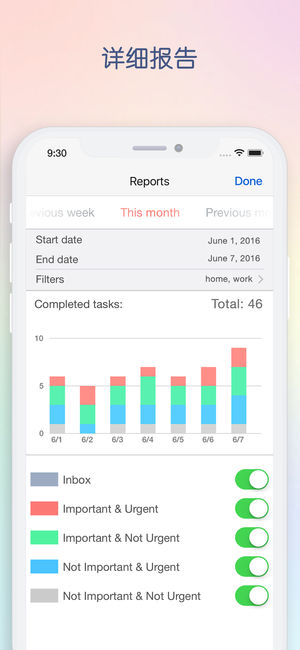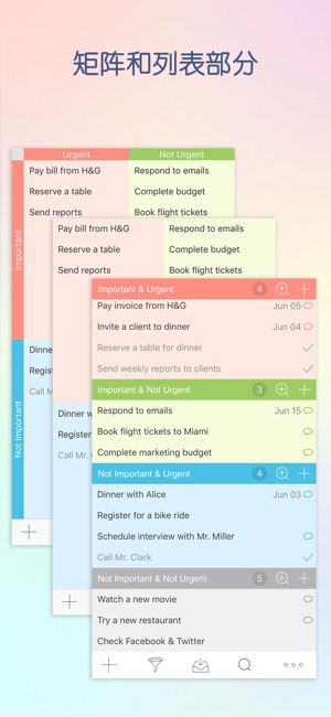 《Focus Matrix 》是一款基于四象限法则的智能任务管理器。该法则由美国第34任总统德怀特•艾森豪威尔创建,是一种个人效率策略。该法则使用一种特别的优先级矩阵,依照任务的紧急性与重要性将其分成几组,可以让您以最高的效率完成当日日程。该应用可以帮您将精力放在重要事件上,移除那些可以转交给其他人或推迟完成的工作。 主要功能: - 双视图:矩阵视图与列表视图 - 通过拖放操作在视图间移动任务 - 最大化视图,更好地查看其内容 - 利用任务的“收件箱“部分可以按象限排序任务 - 设置“全天任务“以规划整个工作日的任务 - 按标题、到期日期排序任务或手动排序 - 向任务指定到期日期 - 设…
