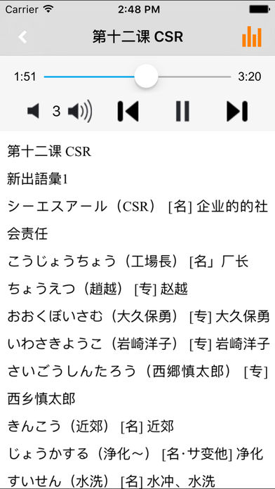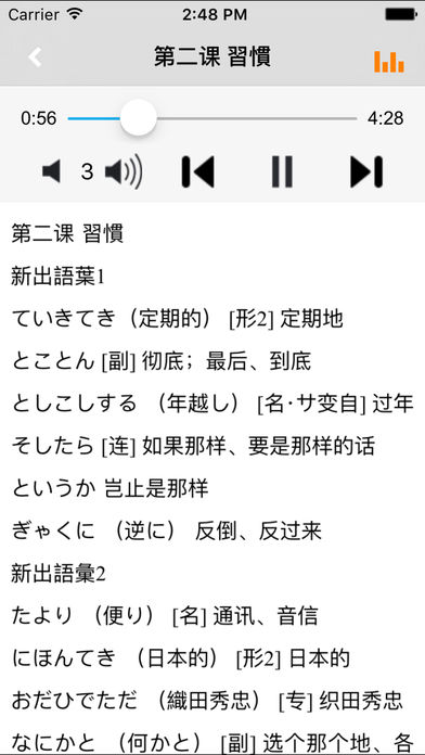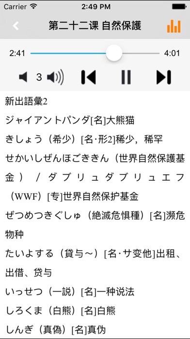 本应用为《新版中日交流标准日本语》单词学习软件。它包括高级上下册共24课全部单词内容,全程真人高音质发音。 使用本应用,配合教材,各个阶段的学习者方便快捷的学习和查阅教材的单词内容,快速高效地记忆单词。 ■完全配合教材单词内容 ■所有词条以课为单位按序编写 ■每个单词都配有真人高质量发音 ■全文朗读功能,锁屏后依然可以练习背诵单词 ■应用可快速返回到最后学习处,不用担心上次学习到哪里 《新版中日交流标准日本语》高级上下册单词,词汇量总数约为2360词,上册约1250词,下册约1110词。音频概括所有课文生词表中出现的单词发音。 为了帮助广大日语学习者能够快速、准确地掌握《新版中日交流标准日本语》词汇表中所列出的词条,我们设计编写了这个词汇手册应用。 本应用打破传统单词记忆模式,拒绝无效率背单词,专注听写应用,快速高效地记忆新标日单词。 无需再制定各种计划,设置各种提醒;无惧背了忘,忘了背;跟随教材,反复听,反复写,反复听写,直至记牢。 *****软件功能***** 1.通用应用,同时支持iPhone,iPod touch,iPad设备 2.可以自动顺序播放功能 3.可以自动记录播放位置,不用担心下次找不到听到哪 4.支持离线播放,即使不联网也一样听,到哪都不怕 5.支持手动拖拽前进、后退播放 6.在兼顾软件容量以及更多课程的情况下,我们最大限度保证音频的高质量,每个有声读物片段都是经过我们精选和亲测 7.最最重要的功能,可以拖动字幕定位,音频随之定位