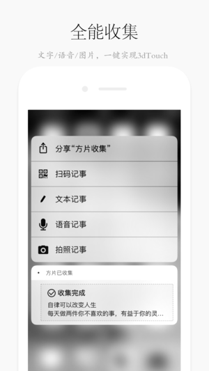 多次获得最美应用、AppSo、爱范儿、小众软件、利器、少数派等知名媒体强烈推荐 ◆资料收集利器,碎片阅读必备,半秒完成收集! ◆从任何APP瞬间收集文字、网址、图片、视频以及任何有用的灵感,无需切换。 ◆还能通过云端实现 #Web #iOS 同步。 ◆语音识别记事,灵感不会丢掉。 ◆从您的微博、微信、朋友圈、QQ、短信、阅读器、浏览器…任何应用中收集灵感和知识。 ◆与在线网站/电脑浏览器版 方片 实时同步。知识、笔记轻松共享。 ◆每条收集都能备份到印象笔记以及其他云存储空间。