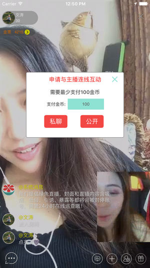 随时随地与美女/帅哥视频互动,7x24小时精彩不间断,休闲娱乐必备神器!K歌,劲舞,cosplay,游戏,模特大赛,FM,脱口秀和有声小说,可以找到同城寂寞无聊的陌生人!更有机会与明星视频面对面!最炫、最酷的舞台,秀出自己的精彩,分享你的喜怒哀乐,够胆你就来! ------------------------------ ------------------------------ 1、汇聚当红美女/帅哥主播,千万用户同时在线,上千直播间同时开播,视频清晰又流畅,聊天逗乐嗨翻天! 2、7*24小时不间断视频真人秀直播!女神萌妹,劲爆好声音,热辣才艺比拼、各色网络选秀、视频互动交友、午夜情感电台…