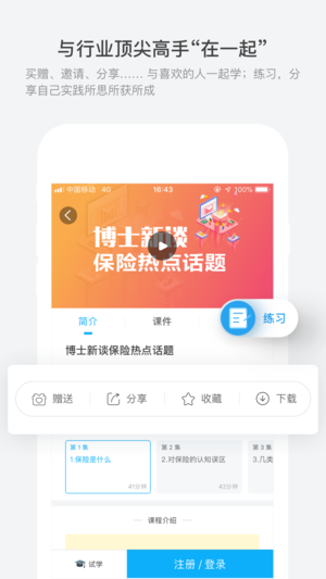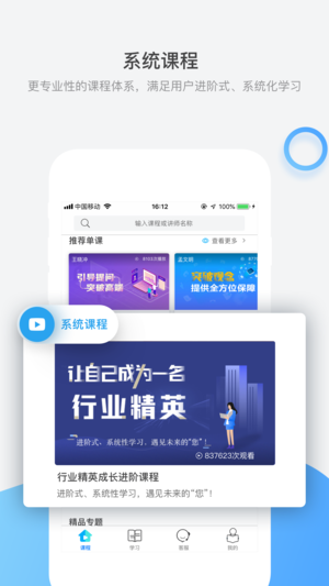 国内寿险首款专业性、体系化的一站式学习平台,结合线下面授班课程提供经典、不受时空限制的在线学习方式,力争成为从业人员身边随时随地可触达的“培训部”;平台课程内容聚焦绩优人员培养、中高端客户开拓、行业精英修炼,以及卓越组织打造等专题,以“窄而深”的方式分享可复制的实战型内容,帮助学习者建立“正确工作、正确思考、正确销售、正确学习、正确生活”重要观念,以引领每一位追求专业化经营人员走向辉煌成功之路。