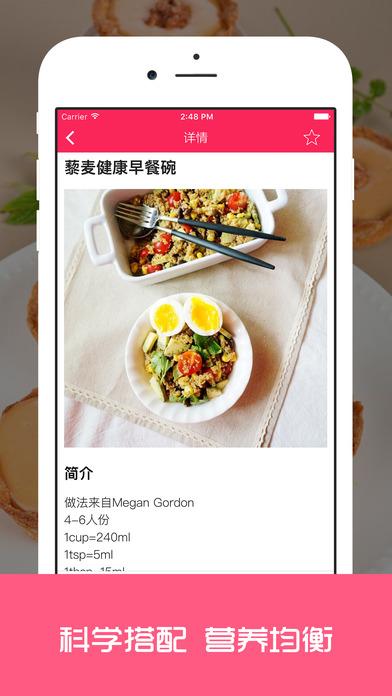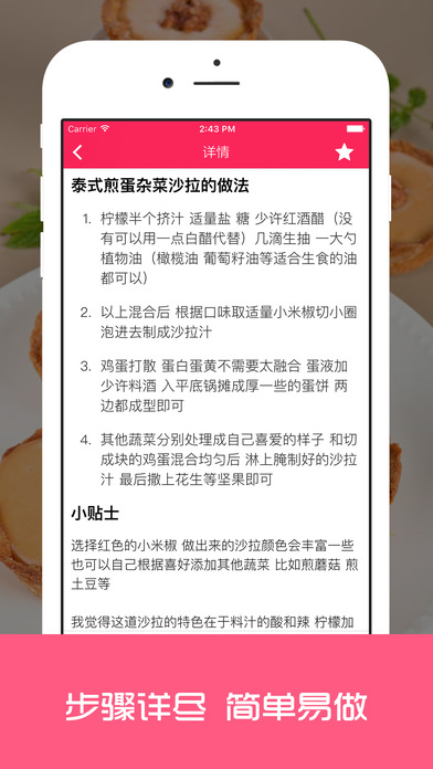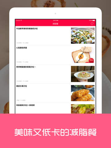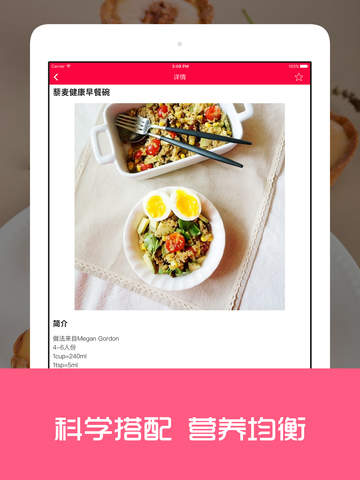 减脂餐食谱App,专为爱健身的你准备的科学营养食谱。 三分练,七分吃,少油少盐低卡的食物才能让你瘦的更快。 减肥餐:提供营养又美味,简单易做的食谱,搭配运动健身,瘦的更快。 美味三餐:为你准备了丰富的早中晚三餐食谱,中式西式家常菜私房菜等各种口味,满足你的味蕾。 步骤详细:从食材准备,到用量比例,再到制作步骤以及注意事项,文字详细,一学就会。 我爱收藏:美味不要错过,一键收藏,快速在收藏夹里找到。
