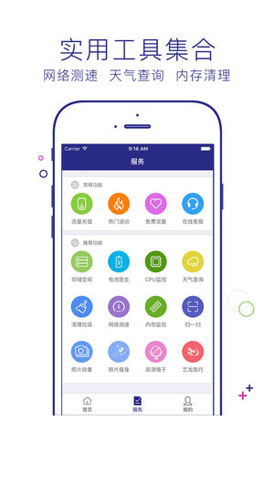 流量营业厅时时监控流量使用情况,杜绝软件偷跑! 【产品简介】 流量营业厅是一款专门为用户定制的集三网流量监控、流量提醒、网络测速等功能于一身的软件。能全面管理您的流量,极大方便您了解流量使用情况及网络情况。 流量营业厅是移动、联通、电信、全民流量充值、网购平台APP,高折扣、价格优惠。再不受wifi束缚,随时无线上网神器。 【亮点功能】 1.流量监控:支持三网流量监控,实时监控,帮助您精确定位流量地图; 2.流量提醒:准确流量预警,帮助您及时避免流量超额; 3.网络测速:专业网络测速,帮助您轻松了解网络状况; 4.智能推荐:采用智能算法,智能推荐所需流量包,更加贴心;
