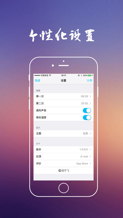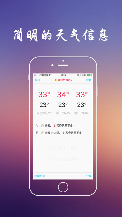 ——————————— !!!特别注意!!!: 很抱歉,本软件只支持少量国外城市,建议国内用户使用。 ——————————— 是否厌倦了花花绿绿的界面? 是否厌倦了乱七八糟的信息? …… 而这些对您的帮助微乎其微,反而浪费了您的时间精力,浪费了设备内存和存储。 天气预报本应该是——简洁的!精准的!高效的! 但是,很遗憾,市面上并不存在…… 然而,您不要感到无奈和沮丧,因为真的被您找到了!在您眼前的就是这么一款天气应用: 小巧轻快(安装快,启动快,存储小) 原生简约(界面清爽,与系统融合) 高效实用(只提供最有用的信息) 本应用使用最精致的算法,为用户提供最直接明了的天气信息。 如果您认同本软件的设计理念,并且正需要这样的软件,请不要犹豫~ 如果您不喜欢,请您去下载其它高级、复杂的天气应用,满足您的需求~ 在使用中遇到任何问题,或者有创意性的建议,请在评论中留言,每条我都会认真查看~如果不想公开您的言论,可以从APP的“设置”-“反馈”给我发送邮件。 如果您喜欢本软件,请抽出一点宝贵时间,给个好评,留下您的足迹,让我知道一下有您的支持~谢谢!