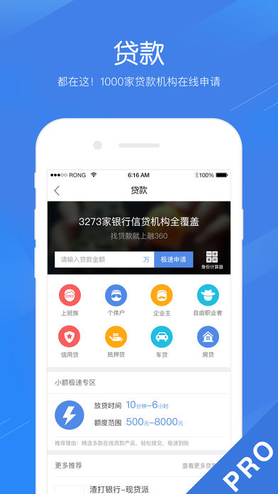 融360 —— 您随身的金融专家 为什么要使用【融360】?下述内容不吹牛。 1. 解决【贷款】难题 特点: - 全面解决:个人消费贷、企业经营贷、车房装修贷、出行旅游贷、学习进修贷、投资理财贷。 - 放款效率:最快仅需一天即可放款。 - 利率优势:月利率仅0.3%起。还款期限3个月起。 - 门槛较低:无需抵押,资质最低只需身份证。注意,资质低风险大利率高,烦请理解。 - 产品多样:超7万款产品,全部由正规金融机构(含银行)提供。安全,可信任。 - 服务优质:我们深知您的难和急。暖心的服务是我们理应为您真情奉献的。 2. 全面的【信用卡资讯】 特点: - 种类繁多:搜索13家银行的千余种信用卡的全面信息。 - 优惠资讯:各行信用卡优惠资讯实时提供,吃喝玩乐省不停。 - 信用卡论坛:信用卡达人和小白都爱逛得专属论坛。 3. 解决【理财】难题 - 本金安全:在融360平台上线的理财产品皆经过严格的风控评估。融360公司不吸收本金,绝不会跑路。 - 收益合适:收益越高必然风险越大。融360平台提供的理财产品收益率通常在5%至15%之间。 4. 提供【金融工具】大全 - 信用报告:在线查询中国人民银行权威信用报告。 - 金融计算器:房贷、个人所得税、公积金与社保的连续度及实缴金额查询。 - 金融资讯:办卡技巧、贷款技巧、投资理财技巧、经济政策、金融趣谈。 融360公司介绍 融360,成立于2011年10月,是中国值得信赖的金融垂直搜索平台。 融360致力于为个人消费者和微小企业提供金融产品的搜索、推荐和申请服务,业务范围涵盖贷款、信用卡与理财。 融360目前已完成D轮融资,估值超10亿美元,步入独角兽俱乐部。 合作的金融机构 - 合作银行:工商银行、建设银行、农业银行、中国银行、招商银行、中信银行、平安银行、浦发银行、交通银行、光大银行、花旗银行、华夏银行、兴业银行、北京银行等。 - 合作机构:宜信(宜人贷)、平安普惠、闪银、51信用卡管家、手机贷、拍拍贷、蚂蚁聚宝、陆金所、玖富、翼龙贷、点融网、有利网、你我贷、铜板街等。 联系我们 —— 【官方网站】http://m.rong360.com 【官方微信公众号】融360 【客服电话】10100360或4008-905-360