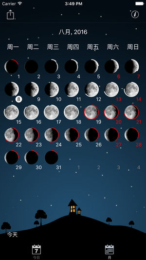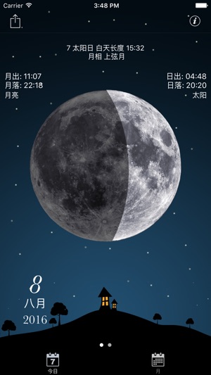 通过本软件您可以摸得到月亮! 您会喜欢本软件的设计和信息的准确性。软件使用简单因此得到很多国家用户受欢迎。软件有多国语言。软件可以自动确定您的语言、所在地区,为您提供准确的月亮信息。您可以知道当天月亮的信息以及月亮运行的轨迹变化,知道每个星座样子。 信息简介: • 月相 • 满月和新月 • 日出日落和月出月落时间 • 太阳日和太阳昼夜 • 月亮落的星座 • 当天日期 • 阴历 预先查看每一天的信息。 本软件是为成人使用而设计出来,不过小朋友也会喜欢使用。 您可以通过此软件得知收获和栽种时间,理发、皮肤护理最佳时间等等。