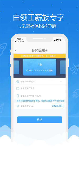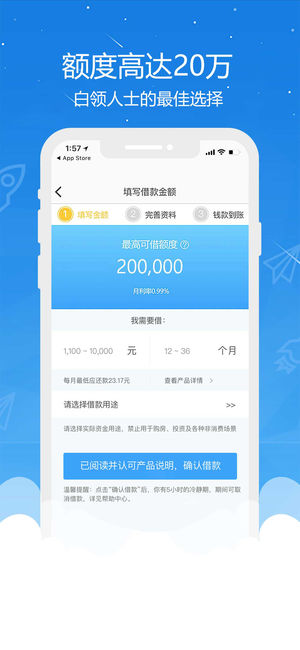 “白领贷”是一款针对白领工薪阶层人士的借款神器。白领贷使用大数据信用审批系统,成功出打造申请、信审、还款全互联网一站式借款模式。多部门监管隐私保护,保障信息安全。 产品特色: 1.极速借款:最快5分钟通过申请,审核通过后,5秒钟匹配到账 2.费率更低:月费率低至0.99%起 3.额度更高:最高可借20万 4.操作便捷:无需社保也可申请,流程简便,无面签 5.安全保障:多部门监管隐私保护,保障信息安全