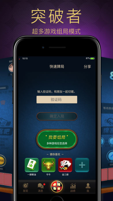 牌客吧-专业牌客聚集地! 最新更新,前所未有“竖屏麻将”,单手可操作。GPS防作弊、入座申请、随时退出、详细复盘、牌局统计、战绩详情...样样俱全!优于市面一切房卡模式! 更有全国首款、独创“牛牛、金三顺”约局游戏;可按您需求DIY每款游戏玩法及功能;游戏积分无需兑换,仅记录战绩结果,只在当局有效。输赢与“宝石”无关!让您用更少的钱!约更久的局! 用“牌客吧”组局玩麻将、牛牛、金三顺,就对了! 本年度最新网赚模式,等待您的开发! 【新游戏!更多组局游戏!】 —牌客吧 竖屏麻将!全国首款,单手可玩! —牌客吧 牛牛!全国首款,牛牛组局! —牌客吧 金三顺!全国独创,金三顺组局! 【无门槛体验,更廉价的组局游戏】 —无需VIP特权,尽享所有房间管理功能! —纯积分模式,游戏积分仅当局有效,输赢与“宝石”无关! —仅收取部分少量功能服务费。让您体验更廉价组局! —量贩式消费模式,让您自主选择服务功能; 【全方位个性化服务和房间功能】 —多平台支持:手机,平板多端无界限操作! —防作弊:开启同IP红名标注:“多开”请“躲开”!; —防作弊:开启GPS防作弊!位置过近不得同桌游戏; —公平公正:超过5000万次专业测试确保发牌、手牌符合概率; —智能管理:中途清分:支持牌局中途向房主申请“清分”离场; —智能管理:房主踢人功能,帮你清除“捣乱”玩家; —智能管理:发现栏目即可同时处理5桌带入申请,省时、省心、省事; —智能管理:人数自由可调:2~9人座位随意设置; —智能管理:可显示“在线观众”,谁在围观一目了然; —智能管理:动态带入:可以在牌局中对每个玩家的总带入限制进行新的调整; —金三顺特色玩法:大牌喜钱!大牌获胜自动获得额外奖励! —金三顺特色玩法:无限模式!无限制下注,可直接Allin! —金三顺特色玩法:圈数设置!可自由设置圈数! —金三顺特色玩法:必闷!可自由设置必下几圈前注! —金三顺特色玩法:比牌圈数设置!可设置起手可比&5圈可比! —牛牛特色玩法:最全坐庄模式!轮庄、定庄、抢庄任选! —牛牛特色功能:自动算牛!开启功能后直接自动算牛! —牛牛特色功能:投注封顶设置!可设置一倍投注封顶额! —牛牛特色功能:自动投注!开启功能后自动投注! —麻将特色玩法:赢家休息!本局赢了,下局休息,换人上桌! —麻将特色功能:支持>20人旁观,可延长房间时长,随时补位! —德州专业玩法:支持发2次牌:专业玩家的选择,稳定收益就靠这个。 —德州专业玩法:可手动设置牌局Ante。加快节奏必选玩法; —德州专业玩法:牌局自由Straddle设置。可自由选择是否使用; —德州特色功能:超大牌型实时统计记录。再也不用“抓拍”; —德州特色功能:超大D位显示。优化体验到每个细节; —德州特色玩法:发牌看看功能,可打赏荷官将剩下的牌发出来看看; —德州特色玩法:一战到底模式:自动下注自动跟注,一战到底; —德州特色玩法:6+模式:去掉5、4、3、2,起手大牌,刺激翻倍! —德州特色玩法:Allin暂停:Allin后自动暂停,5张公牌一张一张翻开,增加刺激感; —VIP特色:VIP折扣:所有消费项可享最高8折优惠! —VIP特色:表情翻倍:2倍的表情包服务“表情帝”! —VIP特色:等座功能:钻石会员独有。无需盯着牌桌看,有空位自动坐下! —VIP特色:留座功能:离座不离席,不起立不发牌,保留座位直到回来坐下。 —VIP特色:可同时开多个牌局。 —VIP特色:可查看上上局回顾。 更多…… 【专业的技术保障确保安全、公平、公正】 使用《欢乐斗地主》《开心消消乐》同引擎开发; 采用全服务器校验机制,杜绝一切作弊外挂 发牌数据加密,从机制上杜绝看牌外挂; 用户信息加密,杜绝用户资料泄露!确保用户隐私安全; 更多……