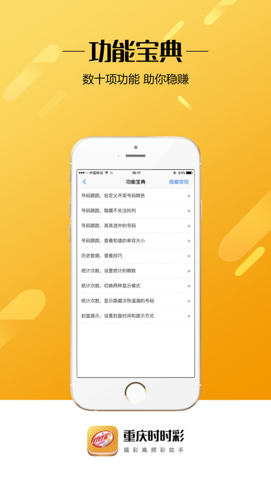 【产品特性】 功能实用,源自实战, 开奖速度快,持续优化。 【功能介绍】 1. 数字颜色可设置,页面名称也可设置,从简单的大小单双到五颜六色随意发挥; 2. 数万期历史数据,免费查看; 3. 实时统计每个数字出现的频次,用颜色体现冷暖热和遗漏; 4. 可根据自己的投注策略自由设置统计期数; 5. 可根据不同平台设置封盘时间; 6. 封盘和开奖均有提示音。