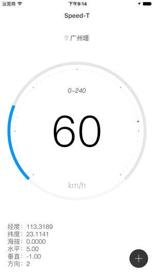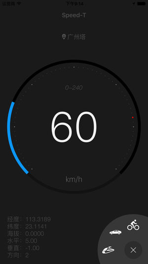 速度表 - Speed-T 【功能】 直接使用内置GPS测速,无需使用网络 仪表盘有三种模式: 自行车0-60 汽车0-240 高铁0-380 【风格切换】用手指右滑仪表盘即可切换 【当前位置】点击上面的地址即可跳转 【使用范围】 方便户外骑自行车的,以及搭汽车或者火车时候进行速度测试。 当然你走路或者跑步时候测试也是可以的:-D