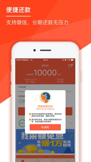 【产品特色】 解救月光族,让您没有后顾之忧。我来贷——年轻人的口袋银行。 纯线上借款审核提现一步到位,3分钟填表快至3分钟放款 多:多种群体均可借款,最高借50000 快:快至3分钟放款,创造行业新纪录,官方微信也可以借款还款 好:纯线上借款App,无需任何纸质文件或抵押,躺着就把钱借了! 省:费率最低3毛1起,不定时发放红包、免息福利 【关于我来贷】 2013年在中国香港创立,2014年进入大陆市场 2015年1月,获得A轮融资2000万美元! 2016年1月,获得B轮融资10亿人民币! 2016年12月,注册用户超过15…