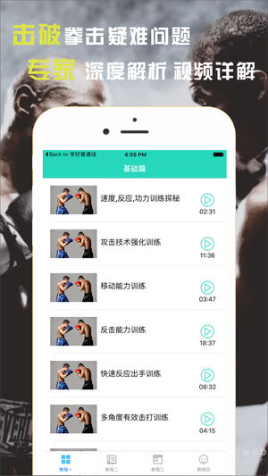 最受拳击爱好者的喜欢的App】 【搜罗了各类精品拳击教程,从入门到提高】 详细介绍了拳击入门基础知识 拳击的步伐,刺拳,摆拳,进攻,躲闪技巧,体能训练,拳法组合,沙袋打法练习等等。。。 练习拳击,强身健体,提高自卫能力!