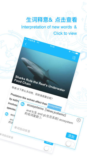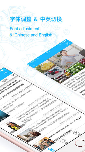 ◈ ◈ ◈ 英语阅读官方平台——爱语吧精品应用 ◈ ◈ ◈ 您还在担心四六级托福雅思阅读文章看不懂么? 您还因为想练习英语阅读却苦于没有合适文章联系么? 现在英语阅读的出现将为您开启一段充满乐趣的英语学习之旅。英语阅读编辑为大家提供最新最热的双语新闻,让您摆脱那些无聊的英语文章,让你快速提高英语阅读水平。 - 特色功能- 【阅读难度】难度设置,四六级雅思托福文章难度供您选择。 【新闻分类】每日更新,英语阅读,不同分类总一款是你感兴趣的。 【离线词典】不懂就点,单词解释实时展现。 【阅读统计】 阅读速度,排名,爱语吧帮你统计。 【私人单词本】自己的单词本,想学什么随时学。