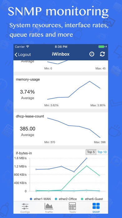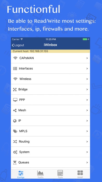 Manage your MikroTik RouterOS v4/v5/v6 devices anywhere, anytime with iWinbox. The app is based on API and API-SSL. You can use this app on both iPhone and iPad. ABOUT PURCHASE First get the app with following functions: 3 devices management, Status tab, read/write configs. Unlock other features with In App Purchase. Device Management • Multi device management, comment and filtering. • Readonly mode. • Secure your devices with port knocking and API-SSL. locked. • Status bar to show whether it is connectable. • iCloud syncing! Backup your device list and restore them. locked. Status Tab(v4/v5/v6) • Resource monitoring. version, uptime, cpu load, memory usage. • Live chart for cpu load and free memory. Configs Tab(v4/v5/v6) • Full features. You can view/edit most settings. • Filter the list items. • Enable/disable/delete/comment list items. • Show description of Mikrotik Documentation when editing a field. • Safe form editing, only save/update changed attributes. • Be able to run System Scripts and get running result. • System shutdown/reboot. Traffic Tab(v4/v5/v6) • Live Tx/Rx charts of interfaces. • Live Tx/Rx charts of simple queues. Tools Tab(v5/v6) • Netwatch settings. • Ping, Bandwidth Test, Flood Ping, Ping Speed. • IP Scan, MAC Scan. • Profile, Torch, Traceroute. SNMP Monitoring Tab(v5/v6) • In one hour/Hourly/Dayly/Monthly Graphs. • Resources usage, eg: CPU, memory, HDD. • Interface bytes in/out. • Queue bytes in/out. • DHCP lease count. • Wireless registration table entry count. • Hotspot user rates in/out. • Get metrics every ten minutes. THE APP IS BASED ON RouterOS API/API-SSL. YOU NEED TO ENABLE API SERVICE ON YOUR ROUTER FIRST. • Enable API service. /ip service set api disabled=no port=8728 • Accept API port in firewall. /ip firewall filter add chain=input comment=Accept iWinbox dst-port=8728 protocol=tcp place-before=0 • Try to connect to your router in LAN first. HOW TO’S Adding New Devices - Tap on ‘+Add a new device’ at the bottom. - Fill host, port, username and password. Readonly mode or comment is optional. - Tap on 'Save button' at the top right. - Tap on the device you just added to connect to the device. Edit/Delete Devices - Click ellipsis button on a device. - Tap on 'Edit' or 'Delete' button. Having any other questions? - Click the Menu button at top left corner in Devices page. - Click the Feedback button. CUSTOMER QUOTE This is amazing and powerful app allow you to control almost everything in the routerOS. The interface is different to web and winbox but, it doesn't matter, you are allow to control and monitor your devices. Is very stable, fast, small and everything is pretty good. - Hgonzale iWinbox's goal is to build the best MikroTik RouterOS toolset on the planet! Feel free to contact us by email. myiwinbox@gmail.com