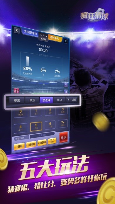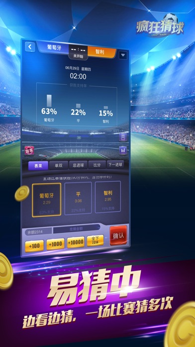 疯狂猜球全面覆盖五大联赛等足球赛事,比分直播、趣味竞猜,好玩刺激! 【产品特色】 1、体育竞猜互动化 将传统的体育竞猜以互动的交互形式呈现,挖掘竞猜的乐趣 2、24小时可参与 覆盖联赛广泛,在各大联赛比赛的重合期,可实现24小时参与赛中竞猜 3、支持200+联赛,支持赛中竞猜 支持对中超、五大联赛、南美主流联赛等200个以上联赛的赛中竞猜 4、玩法简单,猜的快 竞猜足球比赛赛果、猜单双、总进球、比分、下一个进球,不受赛前竞猜限制,比赛中也可随时根据赛场变化,进行实时竞猜。赛中也可边看边猜搭建虚拟球队库,模拟不同国家队在杯赛中进行比赛,24小时不停猜。
