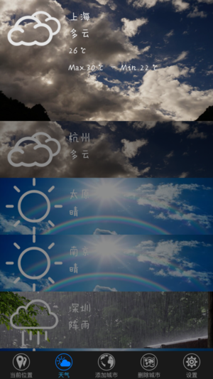 在这里,你可以随意了解当前位置天气信息; 在这里,你可以尽情掌控全国所有城市气象情况; 在这里,给你最温馨的温度提醒和出行关怀。 无论刮风下雨,无论电闪雷鸣,随时随地做你最忠诚的伴侣!