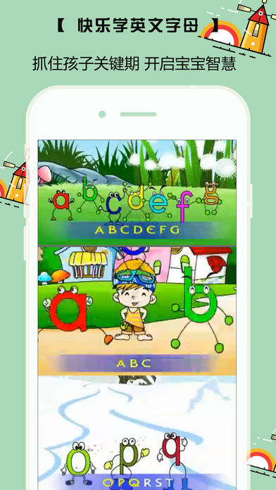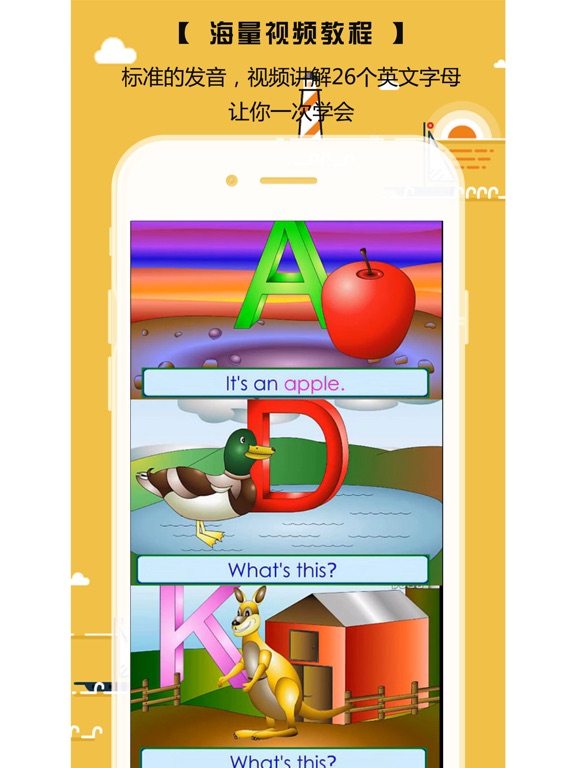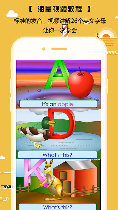 1.26个字母、发音、笔顺练习、单词词汇. 2.多彩的图片、标准的美式纯正发音. 3.全系列支持iPad,iPhone5和iPod Touch Retina 屏幕 App包含26个字母标准的美式纯正发音。针对,内置了多家儿童英语教育机构如朗文、迪斯尼等教材中建议学习单词词汇和精美的图片, 科学且系统; 内置字母大小写书写顺序图片,和笔顺练习; 发音音标和各国发音异同对比。 英文字母是现代英语所使用的二十六个字母,是从拉丁字母衍化而来的。 现在的二十六个英文字母也就是基本拉丁字母的二十六个字母。 学好26个字母对以后单词的学习起着至关重要的作用, 字母的书写过程要一步步进行:先观察性状,再观察笔顺、占格情况,然后书空,最后达到仿写。