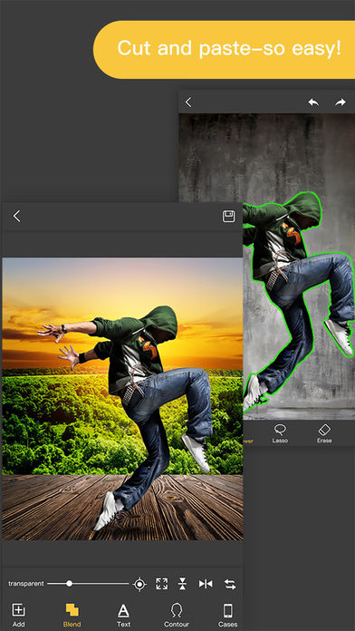 From the markers of Knockout and GhostLens:Knockout 2 has finally arrived to take your photo editing fun even further by offering most powerful cutout tool and image blending features! --------------------------------- Try the most awesome photo cutout and cut me in app- KnockOut, that allow you to make translucent profile and shadow Cutout, especially complex hair edge Cutout, and create professional grade superimposed or juxtaposed photos on your iPhone! Just with one step(Cicle the object that you want to cut out),make a sticker out of any photo by using our magical photo cutout tool! You don't need know how to use the complex software(like Photo Shop and Illustrator).Well now you can with one step of the app!The image which one maintaining transparency background can be used with other apps . KnockOut is so EASY TO USE and allows you to make hilarious pics in unbelievable places. With its Photo Chop Background Adjuster to Superimpose your images and with its WIDE range of backgrounds and POWERFUL features, You can do a lot of unimaginable thing, like you can go to so many places and occasions in a snap. Fooling your friends just became a bit more wicked! Knockout2 Plus subscription - You can subscribe for new weekly updates (every week, new images will be available for download) - Subscriptions are from $2.99 USD weekly, $5.99 USD monthly and $32.99 USD annually* - Payment will be charged to iTunes Account at confirmation of purchase - You will be able to color all available images for the duration of the subscription - Subscription automatically renews for the same price and duration period as the original one week/one month/one year package unless auto-renew is turned off at least 24-hours before the end of the current period - Account will be charged for renewal within 24-hours prior to the end of the current period at the cost of the chosen package (weekly, monthly or yearly package) - Subscriptions may be managed by the user and auto-renewal may be turned off by going to the user's iTunes Account Settings after purchase - No cancellation of the current subscription is allowed during active subscription period - You may cancel a subscription during its free trial period via the subscription setting through your iTunes account. This must be done 24 hours before the end of the subscription period to avoid being charged. Please visit http://support.apple.com/kb/ht4098 for more information - You may turn off the auto-renewal of your subscription via your iTunes Account Settings. However, you are not able to cancel the current subscription during its active period - Any unused portion of a free-trial period, will be forfeited when the user purchases a Knockout2 Plus subscription Links to our Terms of Service and Privacy Policy can be found below Privacy Policy:http://www.biggerlens.com/policy Terms of Use: http://www.biggerlens.com/terms