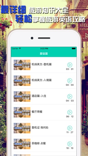 想出国旅游,却又担心语言不通? 看着英文,却读不出来? 有了旅游英语口语大全,这一切不再是问题! 装上这个应用,从此您出国不再茫然无助。帮助您在国外旅游时游刃有余,在一个生疏的环境下生活自如。 ——提供出国旅游常用的英语单词和口语对话,住宾馆,交通,餐饮,购物,娱乐,游览轻松应对! ——给您高质量的听觉享受。了解旅游出行的注意事项,叫你如何听懂导游所做介绍! ——真人播音,循环炫酷复读,快捷方便,懒人必备,轻轻一点,省心省事省流量! ——丰富内容,帮你在旅途中用英语打开国界,认识更多朋友!