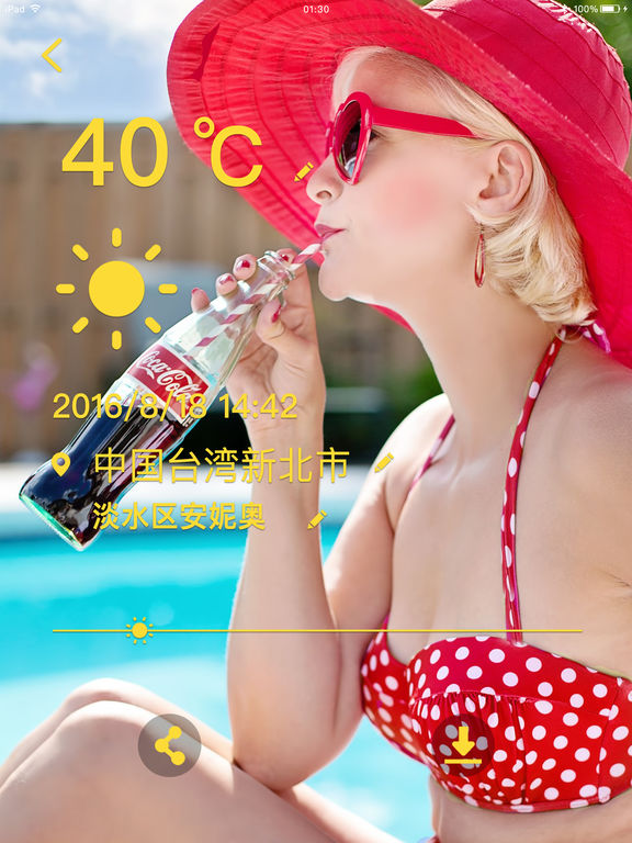 支持iOS10! 最后一天半价!赶快下载吧! 秀天气相机,瞬间get实时天气,拍出有温度的漂亮照片并秒发给朋友。 别人在烤火炉,你在凉爽度日,用秀天气相机,拍照秀天气,秀出你的自在惬意! --特点-- *用实景照片与朋友分享你的天气! *自动天气数据及定位,温度、位置任意编辑! *背景字体颜色随你挑,选择最合适的来搭配你的照片!