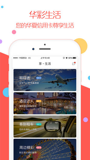 尊敬的用户您好: 华彩生活(原华夏信用卡管家)是我行为信用卡客户量身打造的移动金融服务平台,不仅提供账单查询、积分查询、分期办理、卡片申请、自动还款签约、在线客服、卡片管理、额度调整等基础金融服务,还为您提供“购物消费、旅游出行、游戏充值、便民缴费”等生活服务,给您提供最称心的综合金融服务体验。