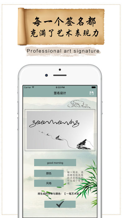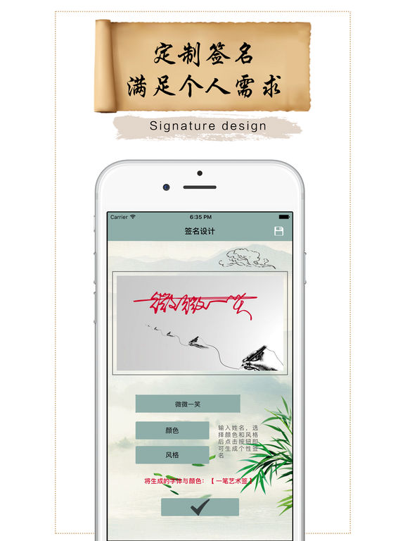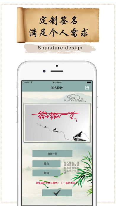 换字体,换颜色,换背景,一键分享,提供多达一百五十种签名样式的艺术签名软件, 集合多位书法艺术大家于一体,软件展现了中华五千年书法艺术的魅力,并融合了各个时期的著名书法家的艺术风格,使每一个签名都充满了艺术表现力。 同时,你可以在软件内临摹生成的签名, 将潇洒的签名分享到过的国内各大社交平台。