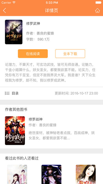 全部免费图书,解放读者钱包,带给广大用户随时随地的免费畅享。 1、从网络原创小说到出版畅销图书,内容囊括玄幻、都市、历史、军事、女性、穿越、言情、灵异、文艺、传记等多个分类。倾心为用户提供丰富多彩的海量精品的图书资源,使用户喜好选择更方便。 2、多种维度的排行榜设置,点击榜、热推榜、飙升榜、最人气的内容第一时间呈现供读者挑选。 3、强大搜索引擎,支持精确和模糊搜索;搜索热词推荐,为读者引领手机阅读的时尚潮流。支持离线下载功能,让读者无网阅读更轻松,全本追更可放肆去看。 4、舒适流畅的阅读器,支持字体、亮度、等多种设置,更有仿真图书护眼风格等贴心设计,适应各类阅读环境和操作习惯,倾力打造免费的极致阅读体验。