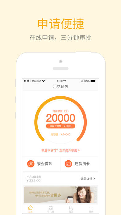 小花借款是小花(厦门)互联网金融信息服务有限公司(简称“小花金服”)为年轻人打造的一款互联网钱包,提供现金借款、代还信用卡及分期购物等服务。采用“生物识别技术+大数据信用评级”的快速审批模式,打造“免费申请,快速审批,极速放款,随借随还”的网络借款体验。 【产品优势】 1.申请便捷 纯线上申请,刷脸拿额度,自动审核。 2.现金借款 快速放款,费率超低,借款1000元,日费用低至5毛; 3.还信用卡 小花替你还信用卡,你分期还小花;费率低至银行7折,代还1000元,月费用低至5.7元; 【背景优势】 小花(厦门)互联网金融信息服务有限公司(简称“小花金服”)是中信产业基金旗下的互联网金融服务公司,中信产业基金目前管理的基金规模近800亿人民币。 【联系我们】 官方微信:xhqb619 官方网站:http://www.xhqb.com 投诉建议: 请按“更多”-“帮助中心”—“联系客服”指引联系小花客服,小花客服能及时看到您的意见并改正,感谢您使用小花钱包。