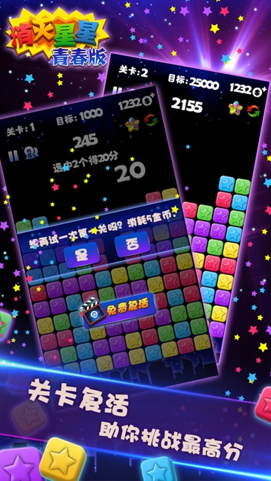 ◆消灭星星App Store下载最多的休闲游戏 ◆在许多国家手机游戏排名第一 ◆史上最完美的消灭星星 ◆特色1.无关卡限制 自动保存 ◆ 2.新道具 实用的接关功能 ◆ 3.画面和可玩性优于任何一款同类游戏 让我们做一个最懂你的消灭星星游戏 世界排行榜 跟好友一起挑战消灭星星最高分吧 点击2个或更多颜色的星星进行选择 再次点击选择的星星进行消除 同色的消灭星星越多,得到的分数越多 谨慎选择,冲击最高分消灭星星