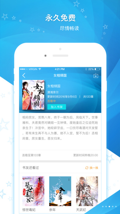 我们的特色。 1. 任意换字体,换主题,换排版,让你的眼睛享受完美的文字视觉冲击。 2. 任意切换翻页动画,平移翻页,上下滚动翻页,纸质仿真翻页,让你的阅读互动更简单。 3. 完美支持TXT,EPUB格式文件,WiFi传书,不管是windows还是Mac OS X,打开浏览器就能连接到手机,轻松把你的书籍上传到免费小说书城。 4. 完美云盘支持,新浪微盘,百度云盘,盛大盘等,只要是云盘,就可以从云盘把书导入到免费小说书城,让你的阅读无处不在。 5. 免费,我们就是免费,并且永远免费,只要你想看书,就来免费小说书城,享受最纯粹的精品阅读时光。 免费小说书城,广大阅读爱好者的一致选择,全网连载小说一网打尽免费看。 专注网络小说追更新,简单快捷,书多,免费看,更新快! 跨站搜索你要的网络小说,随时随地更新提示,一键打开最新章节的网站进行阅读。 一键缓存全本,随时随地离线阅读,从此阅读So easy.