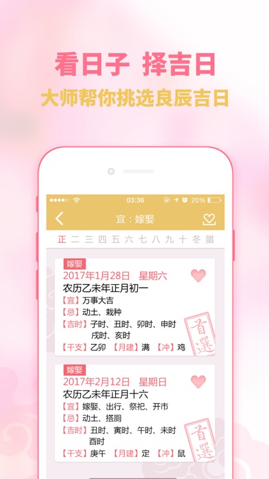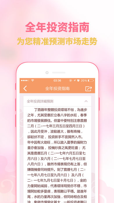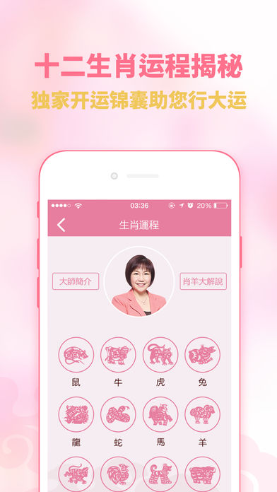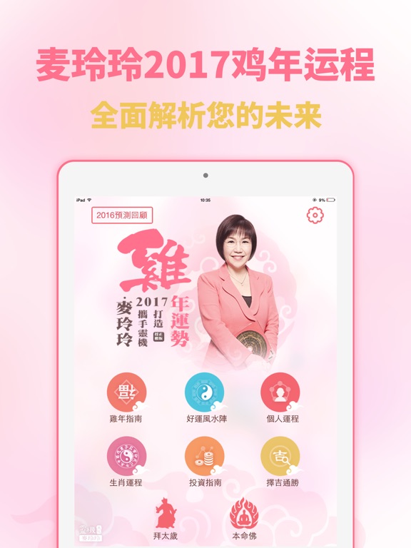 【麦玲玲2017鸡年生肖运程】 大中华地区正版授权,由香港风水大师麦玲玲根据周易五行生克及飞星吉凶的情况,除了给大家讲解每个生肖在2017年里的财运、事业、身体、感情等运势外,还附上世界大势总论,犯太岁化解锦囊,过年习俗知识,每日通胜等精彩内容,而最吸引眼球的是“鸡年行好运风水布局”,结合2017年九宫飞星风水布局来调整每个属相的运气,想旺丁旺财旺事业,得金得银得姻缘的你又怎么能错过?虽然内容极丰富,但是表现出来的形态却极简约。 【APP特色】 APP在色彩上采用温和且具有轻快感的浅色调,传达一种安稳中带点喜悦的情感。而在交互上不得不提的是“个人运势”模块,只要输入出生时辰便可轻松查询到自己的个人运势,除去查询对照表的时间,方便快捷;而“择吉通胜”模块则更加贴心,选择你要进行的择吉类别、月份,轻轻一按便可筛选到当月适合的日子,看起来小小的功能却透漏出对用户的贴心。 【6个清晰的模块】 1.鸡年指南—民俗讲解,如何化太岁,麦玲玲为你指点迷津! 2.好运风水阵—2017拍拖脱单不是梦!2017,我想要提升人缘旺桃花!! 3.生肖运程—十二生肖鸡年运程,好运必备指南! 4.个人运程—玄学天后麦玲玲,为你私人订制的个人运程! 5.投资指南—如何才能在2017年财运亨通投资顺利?投资指南指点投资技巧,助你2017年投资顺利! 6.择吉通胜—结婚订婚要选日子?玲玲师傅帮你择个好日子!