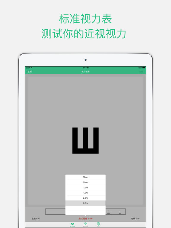 ***最后一天半价!赶快下载吧!*** 专业视力检测工具,两种视力表类型供选择。可改变测试距离,大大减小空间限制。支持摇一摇切换E的显示大小和方向,方便快捷。同时附加色盲检测功能,一物两用~ 最近感觉视力模糊,看东西变得很吃力?是时候给自己的眼睛来一次大检查了!把近视扼杀在摇篮里。 联系我们:np2016.ant@gmail.com