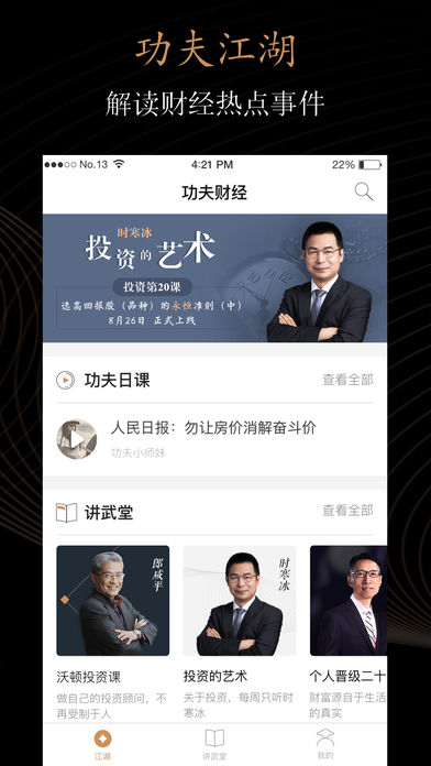 功夫财经-国民财商提升者! 来功夫财经,学习财经知识,提高投资理财能力,赚工资以外的收入! 功夫财经致力于联动最出色的财经学者,提供最优质的原创内容,用户至上,打造中国规模最大的、粘性最高的财富命运共同体,以新型金融服务平台为终极己任,解决中产焦虑,提升国民财商。 平台优势 平台集结了郎咸平、时寒冰、王福重、肖锋、马光远、端宏斌、李大霄、琢磨先生、胡润等专业财经学者,以视频、音频、图文、公开课、线下社交、海外游学等方式提供专业的财经知识产品,提高用户投资理财能力。 功夫财经app的特色 1.可听可看的财经资讯 功夫日课、每日有料的财经资讯与评论,有图文,也有音频,视听双体验。音频可下载,来功夫财经听财经资讯时评。 2.财经学者的投资理财课程 就是订阅专栏,是功夫财经的核心产品,现有郎咸平、时寒冰、端宏斌、王福重、肖锋等财经名家的投资理财课程,订阅财经学者的课程,提高投资理财能力,赚工资以外的收入。 功能介绍 1.功夫日课 每日早上7:30播报与财经相关的热点资讯,有关财经、房价、股市、社会、生活、科技等热点资讯;不仅有图文,还有音频,可听可看的新闻早报。 2.订阅专栏 财经学者的付费课程,每个课程都有免费试听,订阅课程,就可以跟着经济学家学习投资理财的方法,提高投资理财的能力。 3.每日有料 经济学家、财经圈人物对经济、理财、投资、市场的热点时评,有图文,有音频,音频可下载。 4.功夫文章 财经热点资讯,看财经热点评论、经济发展趋势、房价、股市、科技等热门资讯。 2017年7月29日,功夫财经在京成功举办了“功夫财经·炼金之夜”大会,现场规模4000-5000人。 获奖荣誉 2016年度财经新媒体荣誉奖(新榜) 新媒体品牌价值榜·财经类第三名(新榜与《中国广告》联合发布) 金V榜财经自媒体影响力排行榜第五名(《21世纪经济报道》发布) 联系我们: QQ:2949103867 客服电话:400-966-7718 微信:功夫财经