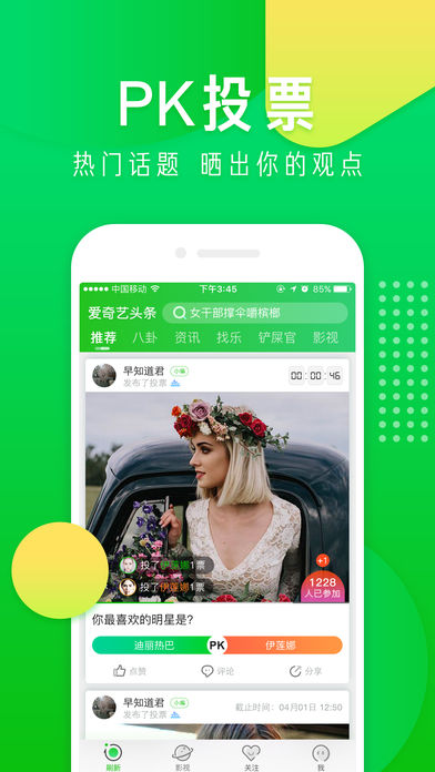 热点、八卦、娱乐,海量资讯随你挑; 明星、热播、视频,就在爱奇艺头条。 爱奇艺头条是爱奇艺为用户精心打造的一款影视、明星周边短视频APP,内容丰富、更新快,真正做到集热剧视频、热点、八卦、资讯于一身,注重互动与体验,是用户充盈碎片时间的最优选择。 【海量内容】各大网站热门新闻尽收罗,全方位满足你的资讯需求。新闻八卦,投资理财,动漫COS,美食音乐,美女直播,出行天气,游戏体育,你想要的一切都可以从这找到。 【个性推荐】 精心优化的推荐算法、独家定制的专属首页内容,为你带来怦然心动的阅读体验。想你所想,给你所要,我们会比你更懂你自己。 【八卦资讯】 明星、爱豆、宝贝、八卦,汇集所有你感兴趣的热点资讯。各大影视周边花絮,明星趣事,全方位满足用户的八卦需求。 【多元呈现】 视频图片随心切换,要闻快讯应有尽有,为你呈现一个丰富多彩、趣味横生的资讯世界。更有超精彩短视频连续观看,让你根本停不下来! 【热点搜索】 首页搜索关键词,所有相关内容全部呈现,图集视频分类查看,任何热点新闻都不会错过。 【大V入驻】 超多明星大V入驻,与你心中的男神女神零距离接触。关注点赞评论,最新资讯一手掌握,让大V带你飞。 【趣味互动】 点赞转发零阻碍,分享评论无门槛,欢迎各路老司机定时发车、吐槽帝插科打诨、斗图王激情交手,不想旁观,就来表演。更有超萌表情,留下你的心情! 【PK投票】 PK投票功能火爆上线,每天都有最热门的话题PK等你来参与。轻松表达你的观点,参与小伙伴的讨论,快来投出你的神圣一票吧。 【一键关注】 一键关注,新鲜趣事、趣味视频、八卦资讯随你挑、任你选,热辣爆料第一时间掌握,带你亲临八卦现场! 【联系我们】 各位小主,使用过程中遇到任何问题,欢迎通过微博、微信与我们联系。微博关注@爱奇艺头条,微信服务号:爱奇艺头条服务号,qq用户群:617767290。
