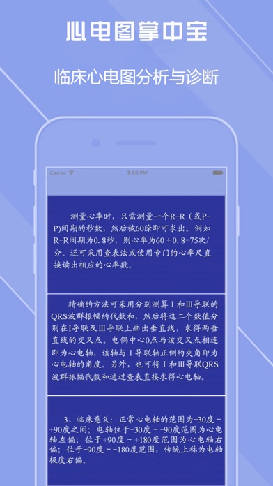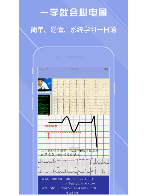 超过1000份真实患者的异常静态心电图案例,供医学院学生或老师作为心电学习的辅助数据。 > 医学生或实习生,可通过这个应用学习各种各样的心电病例 > 医学院老师,可把这个应用作为教学素材,进行案例教学 +++++++++++++++++++++++++++++++ APP STORE 上最具有影响力的心电类应用 +++++++++++++++++++++++++++++++ [应用内包含] 1) 超过1000份真实的心电案例数据 2) 每份案例包含可动态播放的视频,以及来自医生的诊断参考 3) 案例库涵盖了约80个心脏病例特征 [功能] 1) 可按不同的特征浏览案例,比如肺心病,三联律,逸搏心律等 2) 可搜索案例,比如 “预激综合征” 3) 可按视频方式查看心电数据,伴随心跳音提示 4) 可12导联平铺方式浏览全图 5) 导联布局支持 12 x 1, 6 x 2, 4 x 3 6) 每份案例提供12导单独分析图,波形自动检出 7) 可以通过PDF的方式导出所有案例数据,可发送邮件等 [特性] 所有案例以源数据进行存储,并非静态图片,可对波形的细节按像素级别做精细的呈现 [病例特征] 心房扑动 心房颤动 心室颤动 逸搏 房性早搏 PAC二联 PAC三联 室性早搏 PVC二联 三联PVC 室上性心动过速 室性心动过速 室性逸搏心律 心室节律 QT间期延长 短QT 高T ST段抬高 高电压 心室肥大 左室肥厚 左/右心房扩大 左心室肥厚 左心房超载 短PR间 预激综合征 犯罪嫌疑人预激综合征 房室传导阻滞我(文氏/莫氏) 2:1房室传导阻滞 完全性房室阻滞 人工心脏起搏器节律( A / V / D) RSR '模式 IRBBB (不完全性右束支传导阻滞) IVCD (室内传导阻滞) CRBBB (完全性右束支传导阻滞) CLBBB (完全性左束支传导阻滞) ICLBBB (不完全性左束支传导阻滞) LAH LPH BBBB TBBB T波抬升 T波倒置 ST-T异常 早复极综合征 R波递增不良 异常Q波 可能的前壁梗死 前壁梗死 前间壁心肌梗塞 可能的横向梗死 横向梗死 窦性心律 冠状窦性心率 AV交界性心律 房室分离 标记为窦性心动过缓 窦性心动过缓 窦性心动过速 心动过速 心动过缓 极度心动过速 极端心动过缓 窦性心率不齐