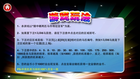 iPhone上真正唯一一款100%还原真实赌场中奖概率的博彩游戏,掌握窍门,您就可以去真机上疯狂赢钱啦! 还记得小时候游戏机厅里跑马机得声音吗? 还记得往游戏机投入牌子期盼中奖得激动心情吗? 还记得中奖的一刹那快乐到极点的眩晕吗? [欢乐跑马机]让你回忆以前快乐的时光,还能避免把许多钱白白送给游戏厅老板的痛苦! 游戏内提供“超多金币”,如果不小心输完,还有无限次“免费”开宝箱的机会(每个宝箱内藏有100至1000的金币),无需等待立刻获得金币奖励。没有内购,没有广告,让你玩到“爽”! 祝君早日掌握技巧,轻松赢钱!
