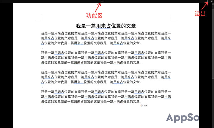 在沉浸式的写作中,Word 依然保留了各项键盘快捷键,复制、粘贴、加粗、居中……使用起来与普通模式也完全一致。如果你在写作的过程中实在需要功能区的各项操作,点击顶部的「…」,也可以调出功能区,为了不干扰写作,功能区被设计成了纯黑色。