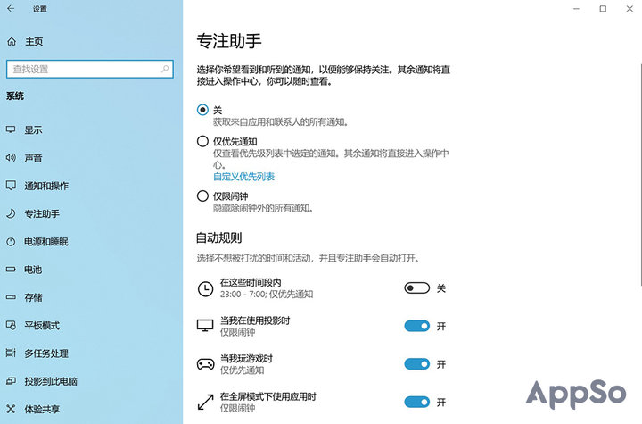 在焦点模式中,Windows 系统会同时进入关注模式,除闹钟外,任何通知、弹窗都不会打扰你,当然,你也可以根据自己的习惯,自主设定专注模式的免打扰等级。