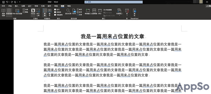 通过功能区「视图→沉浸式→Focus」就可以进入焦点模式,这时,Word 会隐藏功能区,仅留下黑底白纸,变成全屏写作模式。