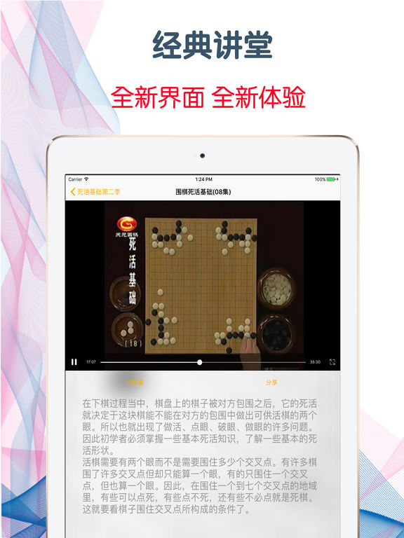 在下棋过程当中,棋盘上的棋子被对方包围之后,它的死活就决定于这块棋能不能在对方的包围中做出可供活棋的两个眼。所以也就出现了做活、点眼、破眼、做眼的许多问题。因此初学者必须掌握一些基本死活知识,了解一些基本的死活形状。 活棋需要有两个眼而不是需要围住多少个交叉点。有许多棋围了许多交叉点但却只能算一个眼,有的只围住一个交叉点,但也算一个眼。因此,在围住一个到七个交叉点的地域里,有些可以点死,有些点不死,还有些不必点就是死棋。这就要看棋子围住交叉点所构成的条件了。 本应用独家载入方天丰老师讲述的《围棋死活基础》37集全高清离线教程,教程共分为4季。 软件功能: 1.性能流畅,同时支持iPhone7,iPod touch和iPad设备 2.高清视频,让您在流畅使用应用的同时学习到必要的知识 3.可以收藏您所喜爱的课程,这洋即使在旅途中也可以随时拿出来回味欣赏 4.支持离线播放,即使没有蜂蜗数据的情况下也可以看您喜欢的课程 5.支持手势快进、后退、调高亮度与声音,这一切都丝滑顺畅 6.支持多任务功能,让您可以在学习喜爱的课程同时与亲人朋友不间断亲密的钩通