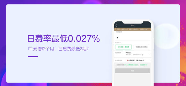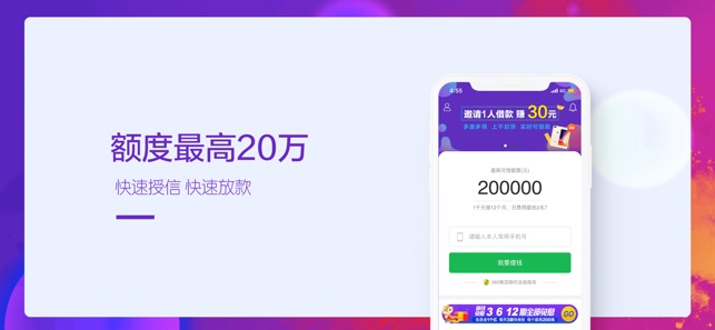 【产品简介】 360借条是福州三六零网络小额贷款有限公司旗下个人及小微信贷平台,依托360集团先进的互联网安全技术及大数据技术,基于海量用户信用数据及行为数据,致力健全国内个人信用体系,提高金融服务效率,降低成本,为有融资需求的社会各群体提供安全、稳定、便捷的消费贷款金融服务。 【产品特点】 1、手机贷款额度高: 500元起借,额度最高20万,现金款项秒速到账; 2、偿还贷款息费低: 贷款日息费最低0.027%,贷款1000块每天最低只要2毛7息费; 3、还款给方式灵活: 可根据实际需要灵活选择不同的还款方式(可分3期,6期,12期); 4、手机贷款更便捷: 贷款全程线上申…