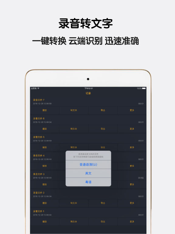 录音机是一款高品质录音软件,独家技术音质处理,还原真实音质! 【语音转文字】 支持录音文件转文本(多国语言),智能理解语义、断句,识别迅速,准确率高! 【录音导出】 支持iTunes和邮件方式导出录音文件,录音信息完整记录,方便快捷! 【语音录制】 独家音质处理,分段录制,还原真实音质! 【转义文本复制】 针对语音提供多种转义,一键复制所有语义结果! 【录音管理】 支持删除、修改录音!
