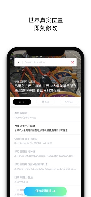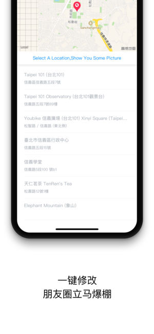 新版促销!抓紧下载! 如果有什么问题和想法,都在可以群里面来提 本应用没有任何内置购买、广告及限制使用次数等而外付费功能。 **独家功能** 图片推荐:没有合适的图片可以发?我们推荐给你全世界的旅行、美食、著名景点图片,让你一次发个够! 如果您是摄影爱好者,我们的app能为您的每一张相片加上GPS定位信息,真是满满地回忆啊! -------------- @新版微信定位问题说明: 由于微信新版关闭了获取照片地址的功能,所有同类app都无法解决,只有等微信重新开放。 目前我们找到了临时解决方法,如有需要,请加QQ群(群号在app中查看) 我们会为您提供最好的服务! @使用小技巧 搜索的时候使用…