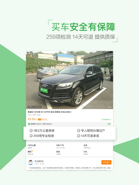 【瓜子二手车直卖网】国内领先个人二手车交易平台! 买卖二手车,上瓜子二手车直卖网! 个人车主直接把车卖给个人买家,没有中间商赚差价! 100%个人二手车,直接和车主交易,好车更便宜! 259项全车专业检测,成交过户前车况复检,使用更安全! 专人全程陪同交易,瓜子担保支付,购车全程无忧! 14天可退1年质保,瓜子品牌保障,值得您放心! 二手车贷款全程服务,让您选车容易,买车不难! 【二手车购买服务】 1.全国车辆随时可见,心仪车辆随时可得; 2.评估师259项全车检测,严苛检测标准,保证车辆无事故; 3. 14天可退1年质保,买车放心用车安心; 【二手车售卖服务】 1. 直面个人买家,好车卖好价; 2. 免费上门服务,专业团队一站式解决卖车所有问题 3. 海量买家,极速成交,最快当天售出 4. 无需寄存,边开边卖,方便舒心 -----联系我们----- - 客服电话:400-733-6622 - 官方微博:@瓜子二手车直卖网 - 微信公众号:guaziershouche - 官方网站:www.guazi.com