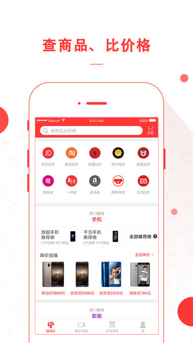 喵喵折,手机必备购物APP,支持全网电商180天历史价格查询、比价,包括京东、淘宝、天猫、亚马逊、苏宁易购、当当、1号店、国美、网易考拉等。24小时更新电商正品打折团购优惠,让你抄底历史最低价,精明消费,省钱又省心。 【应用特色】 「历史价格」展示商品180天历史价格曲线,识别虚假打折促销 「全网比价」一键搜索全网商城,帮助您查询实惠的网购渠道,复制商品链接也可以查询历史价格 「扫码比价」扫描商品条形码、二维码,可以快速帮您搜索各大电商的价格 「逛商城」通过喵喵折访问京东、淘宝、天猫等电商,实时为您提供历史价格、同款比价、商品收藏等服务 「降价直播」集合全网品牌电商正品打折降价消息,24小时实时直播 「优惠搜索」网罗全网95%打折优惠信息,想买的商品都有优惠价 「神价格」精选全网商家6折以下商品,都是历史新低价,价格比团购还低 「热门晒物」用户真实购物体验分享,告诉你什么值得买 手机比价就用喵喵折! 【联系我们】 喵喵折将会不断更新和完善APP,敬请关注支持!欢迎加入QQ群交流! 用户QQ群:63372080、250733449
