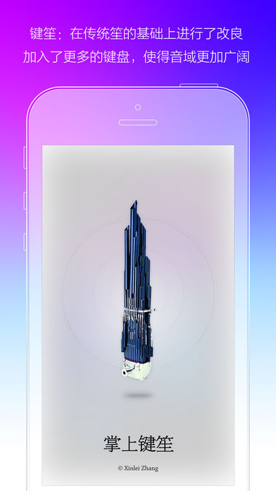 掌上键笙,你口袋里的智能键笙吹奏神器 • 对着麦克风吹气产生美妙的音乐,移动不同的指法创造出旋律,灵敏的感应你的吐气、手指移动和触摸 • 所有键笙音源均由中央民族乐团笙声部首席,著名笙演奏家吴学伟在录音棚真实采样录制完成 • 共计48个键笙音源,最低音大字组G,最高音小字三组#f3。每个音源相差半音(小二度),也就是可以演奏近4个八度(少1个半音) • 吹奏时,食指中指控制指法,无名指控制临时升降八度,小指控制临时升降半音,拇指用于掌控iPhone • 吹奏时,可以通过调整嘴巴与麦克风的距离,或者通过控制吹气力度,来调节吹奏出来的实际音量 • 提供12个调:G、#G、A、#A、B、c、#c、d、#d、e、f、#f,默认c调 • 提供高音键笙、中音键笙、低音键笙,默认中音域键笙 • 未吹奏时,点击高低半音按钮,或滑动调号滚轮,可变调 • 未吹奏时,点击高低八度按钮,或滑动音域滚轮,可将键笙调整至中音域、高音域、低音域 • 自带气震音效果,使音乐得到一种自然、松弛、及悠扬的歌唱性,使键笙的音质产生一种圆润、丰满的美感 • 《春节序曲》、《花儿为什么这样红》、《草原骑兵》、《山乡喜开丰收镰》、《凤凰展翅》、《晋调》、《南海渔歌》、《海南春晓》、《沂蒙山歌》、《孔雀开屏》、《天鹅畅想曲》,等键笙经典曲目均可简单上手演奏 关于App代言人吴学伟 著名笙演奏家,中央民族乐团笙声部首席,中国音乐家协会会员,中国民族管弦乐学会会员。第七届中国音乐金钟奖银奖获得者,文化部第十届民间器乐展演金奖获得者,香港佛教音乐文化形象大使。曾先后跟随笙演奏家翟成兴,阎津生,杨守成,朱家明等老师学习,受益匪浅!通过多年努力他的演奏愈加完美,高超娴熟的演奏技巧、对乐曲深入的理解以及丰富的舞台表现力,使他形成了独特的演奏风格。 2002年7月以优异的成绩考入中央民族乐团。2006年参加澳大利亚盛装民乐的演出,并担任了连续11场演出的独奏任务,在悉尼歌剧院演绎笙的名曲《晋调》,获得在场观众的热烈掌声,并获得著名作曲家赵季平先生的高度赞扬和认可,本次演出亦被澳大利亚的媒体多次播放,被称为“星光璀璨、余音绕梁”的生动演绎。2010年出版了个人首张专辑《笙歌》。2013年2月与美国北卡罗莱纳交响乐团合作演出刘文金先生的笙协奏曲《虹》,获得极大的成功,被美国知名乐评人约翰.兰伯特誉为当晚最富戏剧性的演出!2013年4月在国家大剧院与著名指挥家张国勇先生再次合作这首协奏曲,反响强烈!2014年5月在拉美北京艺术节上与著名指挥家陈燮阳先生合作演出由著名作曲家姜莹女士改编的阿根廷乐曲《自由探戈》,同年6月在海内外纪念民族音乐家刘文金先生大型专场音乐会上,与著名指挥家王甫建先生再度合作笙协奏曲《虹》!在2015年《又见国乐》剧目的演出中担任春节序曲的主演!在2017年3月于北京音乐厅成功举办《竹影间》个人专场独奏音乐会!工作至今已随团访问了法国、德国、西班牙、比利时、意大利、丹麦、荷兰、捷克、奥地利、马耳他、俄罗斯、美国、墨西哥、哥伦比亚、秘鲁、澳大利亚、埃及、乌兹别克、日本、韩国、香港、澳门、台湾等国家和地区。 关于键笙 古时大笙称为“芋”,小笙称为“和”传统笙一般为十三簧与十四簧,经过改良后有二十一、二十四、二十六、三十二、三十四、三十六簧等多种。新中国成立后,中国的乐器制造者对笙进行了不断的改革,先后试制出扩音笙,加键笙等多种新品种。克服了音域不宽,不能转调和快速演奏不便等缺点。笙的音色明亮,甜美,高音清脆透明,中音柔和丰满,低音浑厚低沉,音量较大,也是吹管乐中唯一能够吹出和声的乐器。在和其他乐器合奏的时候,能起到调和乐队音色,丰富乐队音响作用,在大型民族管弦乐队里,常用的就是高音、中音和低音三种笙。 同时请关注Xinlei Zhang的其他软件:民乐调音器,寻找背景音乐,掌上竹笛,掌上唢呐,陶笛Ocarina 使用过程中有任何意见或建议,可联系客服QQ:776551472