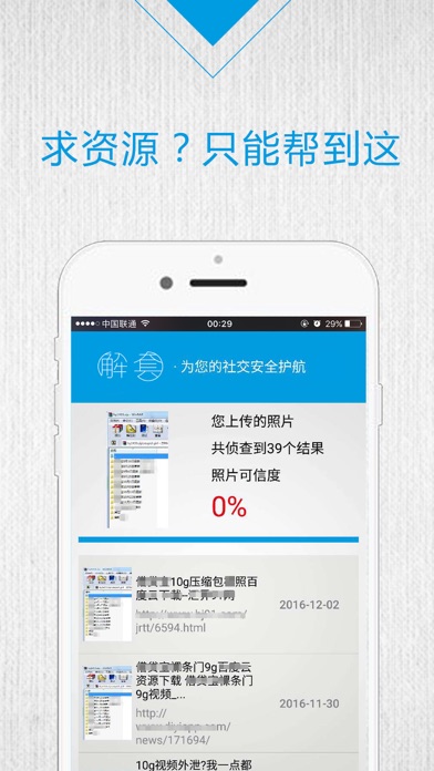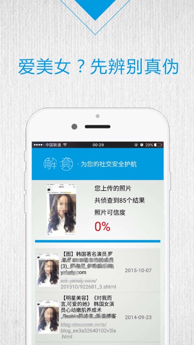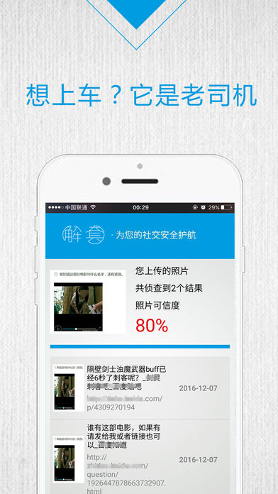 图片找出处,电影找来源,照片可信度——解套App,是一款可以帮助用户识别对方头像是否真实、鉴定可信度的图片识别工具,让日益兴盛的移动网络社交增添一分真诚的保障。