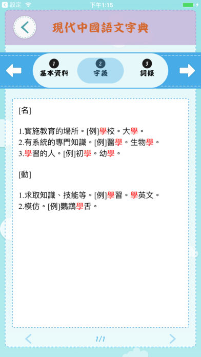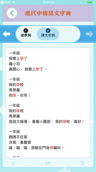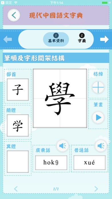 《现代中国语文字典》专为小学生而设,不单可用来查阅字义,更附有多项内容及功能促进小学生学习语文,并以《现代中国语文》课文句子作例句,集工具和教材于一身。 特色 *包含香港小学课程5,000多个常用字,支持小一至小六学生学习字词。 *提供多个例词例句,让小学生学习运用字词。 *其中3,000字设有笔顺示范,查字同时学写字。 *简单易用,便于小学生自行操作。 功能及内容介绍 1.检索方式 -直接输入 -部首索引 -笔画检索 2.读音 -广州话:附读音、粤语注音,提供多音字读音。 -普通话:附读音、普通话拼音,提供多音字读音。 3.文字资料 -部首 -简体字 -异体字 -笔顺演示(动画示范正确笔顺,可显示田字格或九宫格学习字体) 4.字词数据 -字义:列明文字的词性及相关的解释,并提供例词。 -词条:列明各例词的解释,附例句说明用法。 -字词辨析:指出小学生用字时常犯的错误,说明正确的用法;辨析字义相近的字的用法。 -逆序词:列举包含检索字的逆序词,丰富学生的识词量。 -课文引例:列举包含检索字的《现代中国语文》课文句子,提供更多例句给学生参考。
